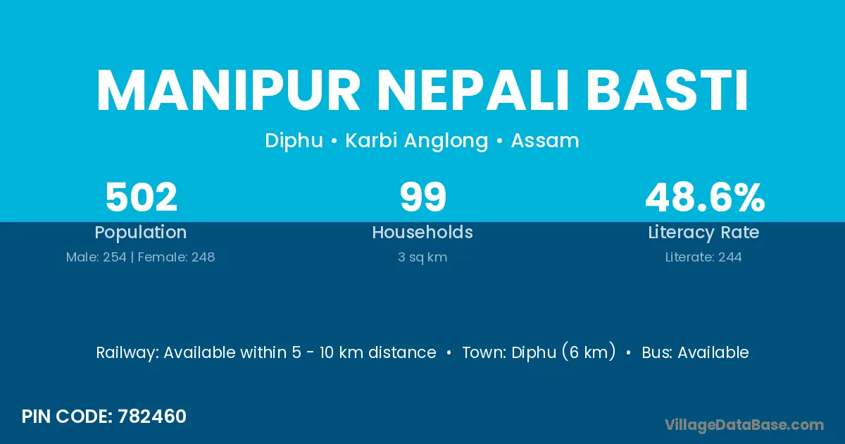 Diphu (6 km) is the nearest town to Manipur Nepali Basti village for major economic activities and is located approximately 6 km away.