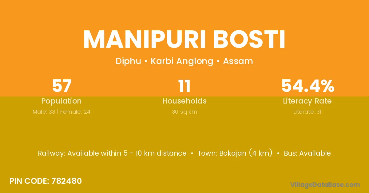Bokajan (4 km) is the nearest town to Manipuri Bosti village for major economic activities and is located approximately 4 km away.