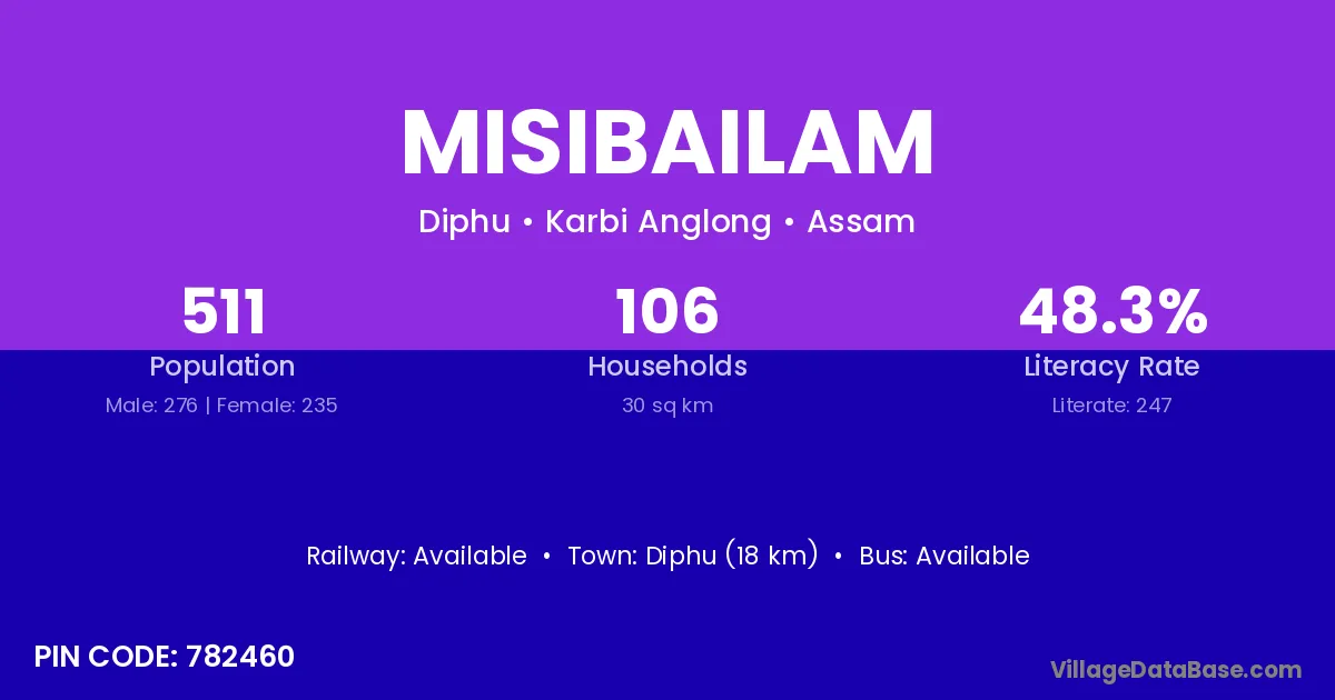 Diphu (18 km) is the nearest town to Misibailam village for major economic activities and is located approximately 18 km away.