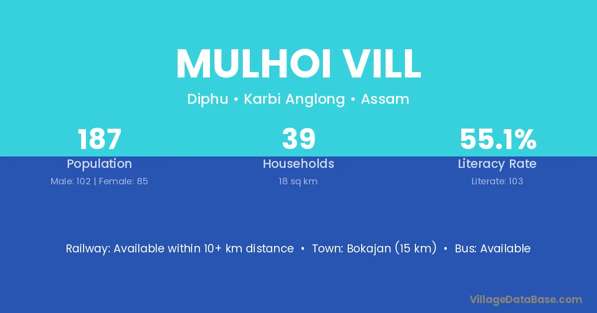Bokajan (15 km) is the nearest town to Mulhoi Vill village for major economic activities and is located approximately 15 km away.