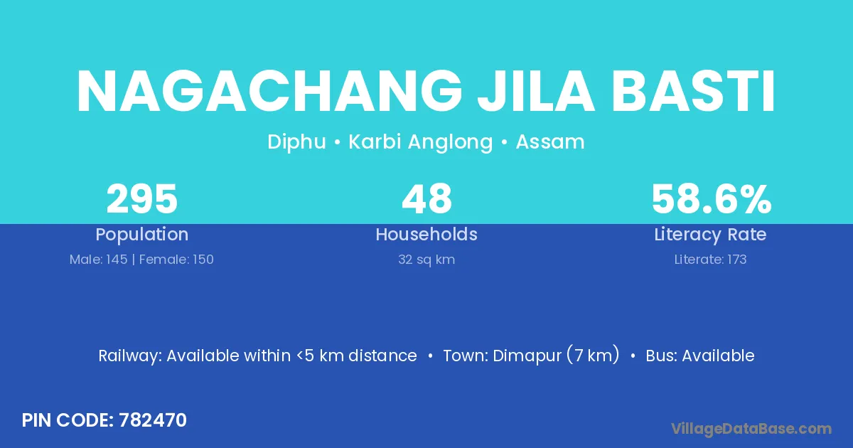 Dimapur (7 km) is the nearest town to Nagachang Jila Basti village for major economic activities and is located approximately 7 km away.