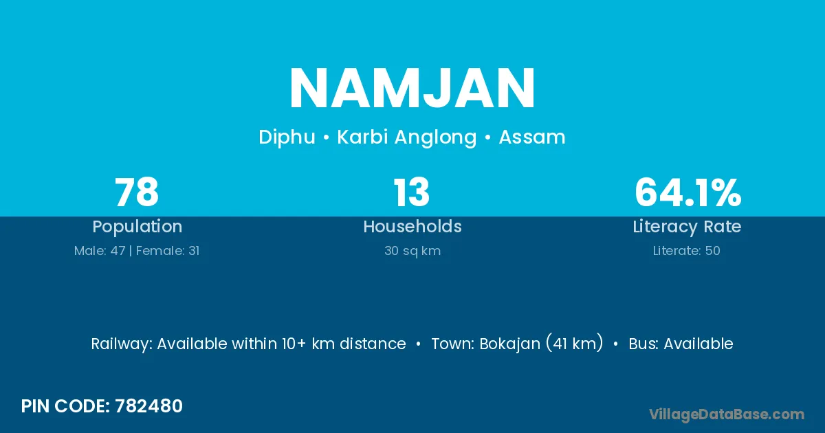 Bokajan (41 km) is the nearest town to Namjan village for major economic activities and is located approximately 41 km away.