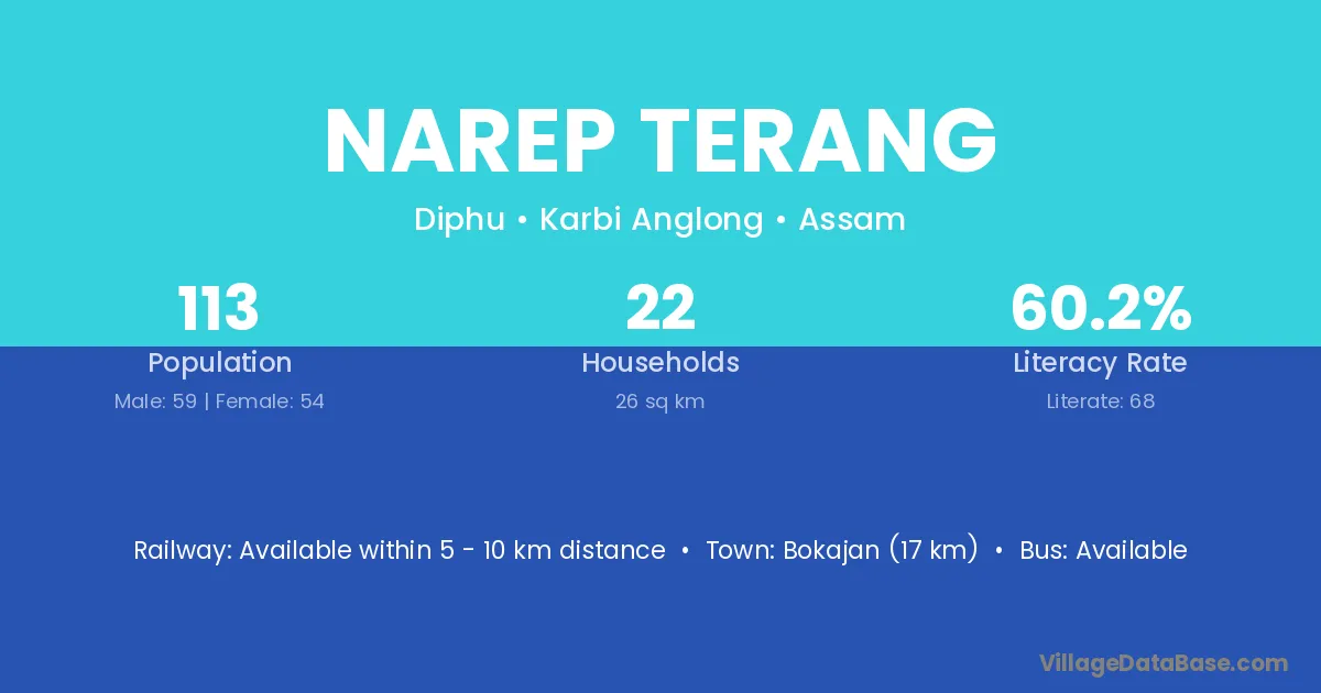 Bokajan (17 km) is the nearest town to Narep Terang village for major economic activities and is located approximately 17 km away.