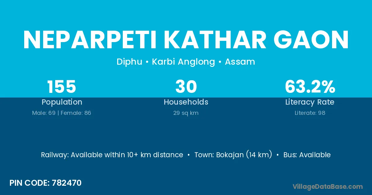 Neparpeti Kathar Gaon village has a total population of 155 people, of which 69 are males and 86 are females.