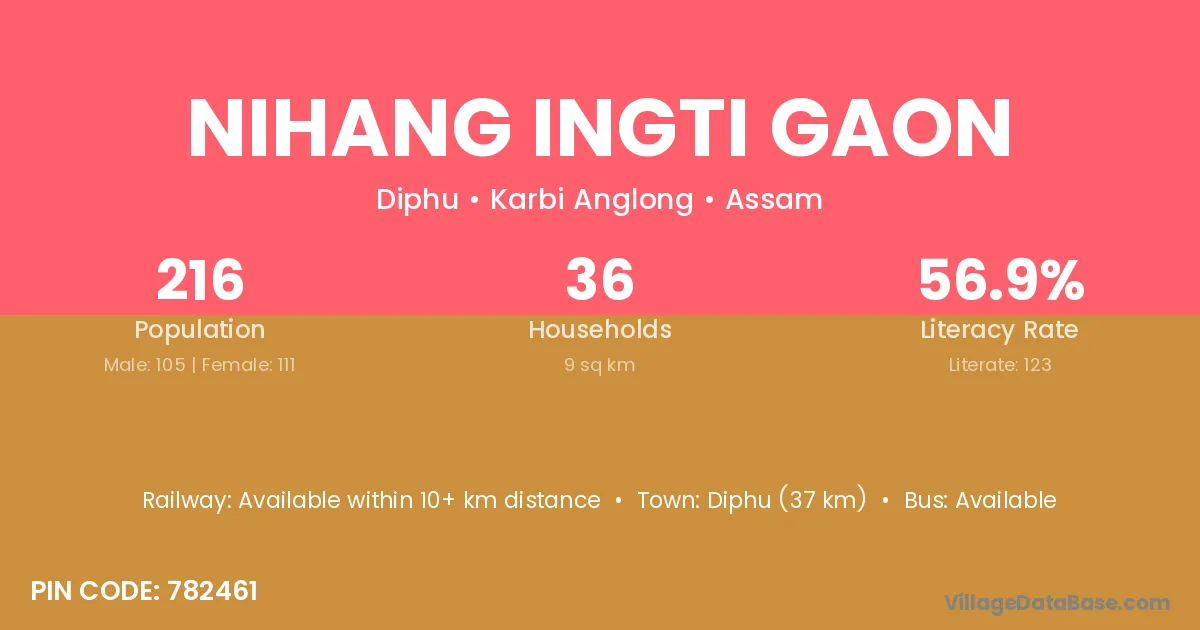Diphu (37 km) is the nearest town to Nihang Ingti Gaon village for major economic activities and is located approximately 37 km away.