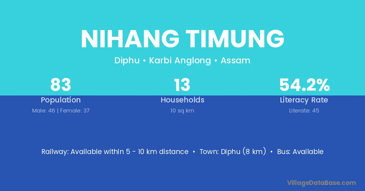 Diphu (8 km) is the nearest town to Nihang Timung village for major economic activities and is located approximately 8 km away.
