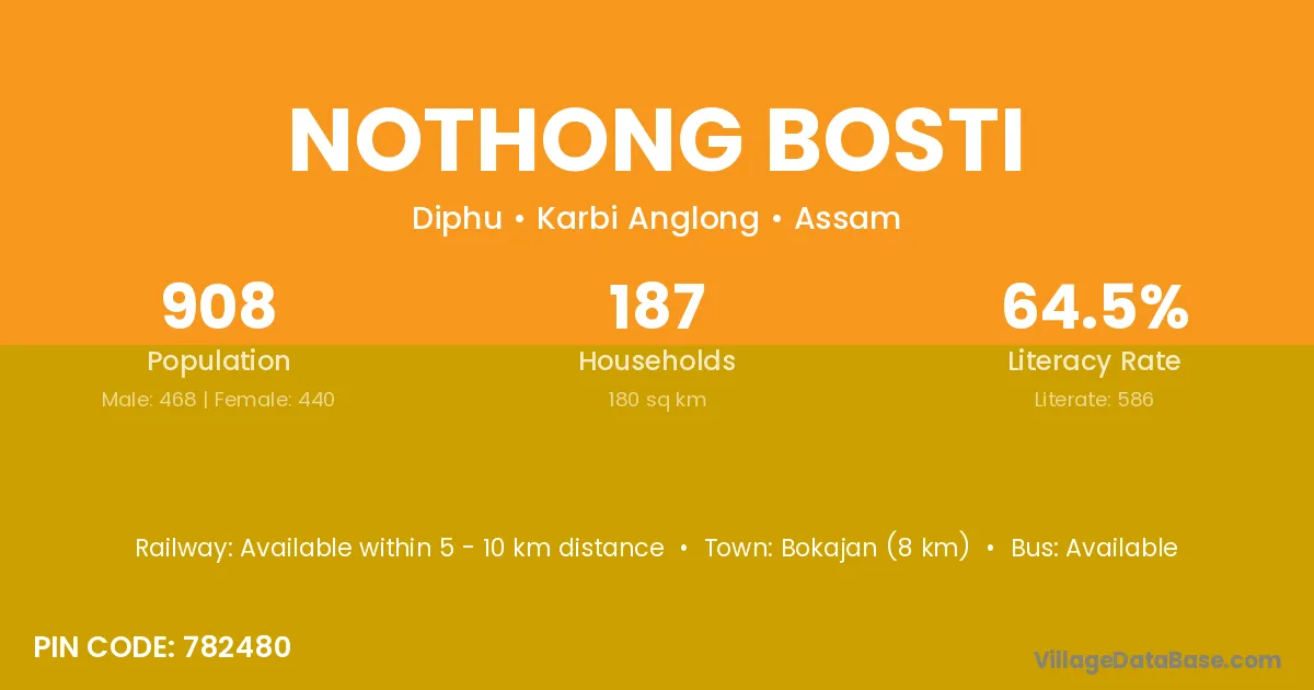 Bokajan (8 km) is the nearest town to Nothong Bosti village for major economic activities and is located approximately 8 km away.