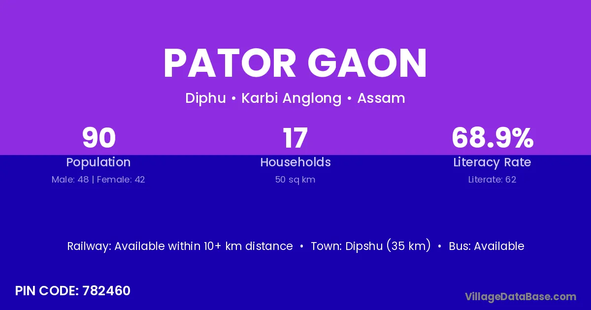Dipshu (35 km) is the nearest town to Pator Gaon village for major economic activities and is located approximately 35 km away.