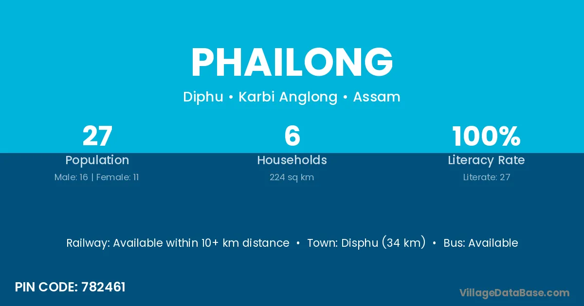 Disphu (34 km) is the nearest town to Phailong village for major economic activities and is located approximately 34 km away.