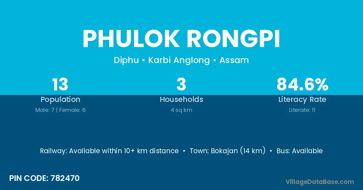 Bokajan (14 km) is the nearest town to Phulok Rongpi village for major economic activities and is located approximately 14 km away.