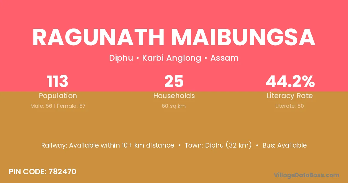 Diphu (32 km) is the nearest town to Ragunath Maibungsa village for major economic activities and is located approximately 32 km away.