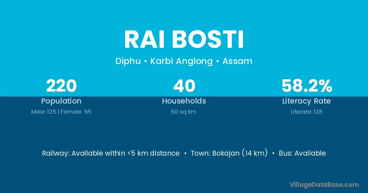 Bokajan (14 km) is the nearest town to Rai Bosti village for major economic activities and is located approximately 14 km away.