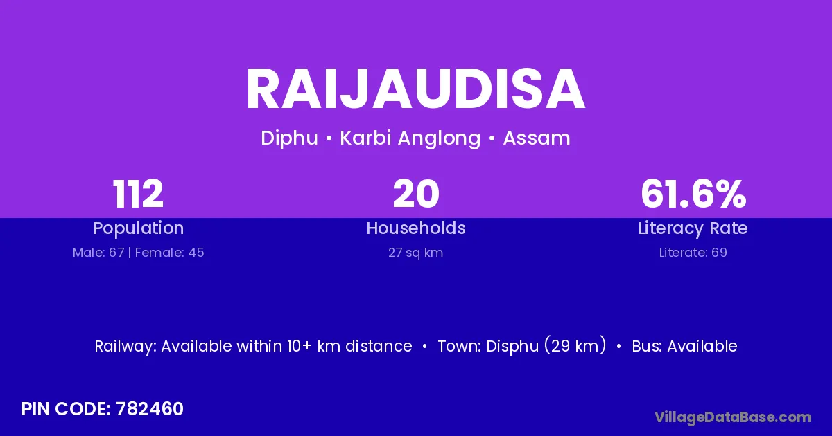 Disphu (29 km) is the nearest town to Raijaudisa village for major economic activities and is located approximately 29 km away.