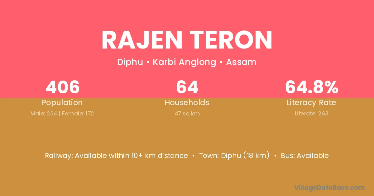 Diphu (18 km) is the nearest town to Rajen Teron village for major economic activities and is located approximately 18 km away.