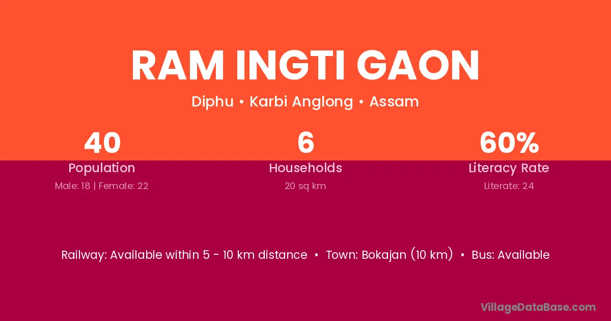 Ram Ingti Gaon village has a total population of 40 people, of which 18 are males and 22 are females.