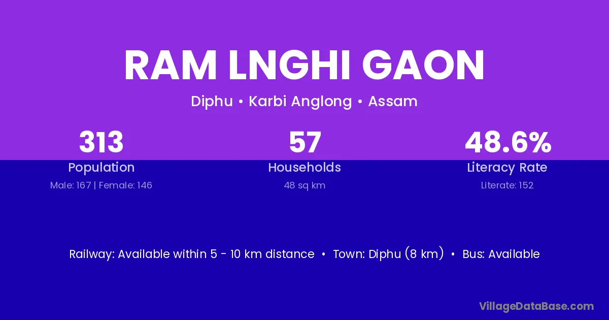 Ram Lnghi Gaon village has a total population of 313 people, of which 167 are males and 146 are females.