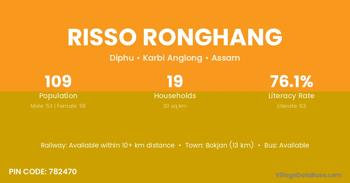 Bokjan (13 km) is the nearest town to Risso Ronghang village for major economic activities and is located approximately 13 km away.