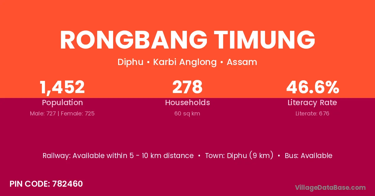 Diphu (9 km) is the nearest town to Rongbang Timung village for major economic activities and is located approximately 9 km away.