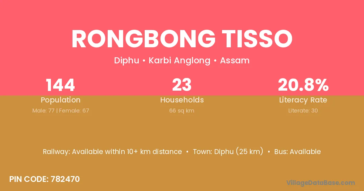 Diphu (25 km) is the nearest town to Rongbong Tisso village for major economic activities and is located approximately 25 km away.