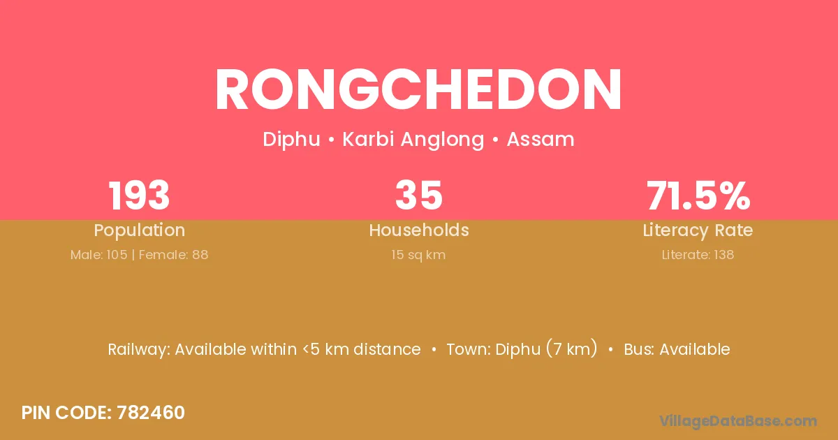 Diphu (7 km) is the nearest town to Rongchedon village for major economic activities and is located approximately 7 km away.
