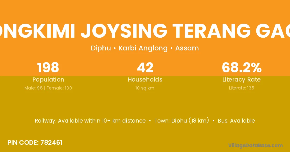 Rongkimi Joysing Terang Gaon village has a total population of 198 people, of which 98 are males and 100 are females.