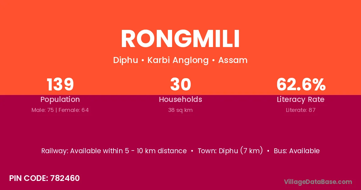 Diphu (7 km) is the nearest town to Rongmili village for major economic activities and is located approximately 7 km away.