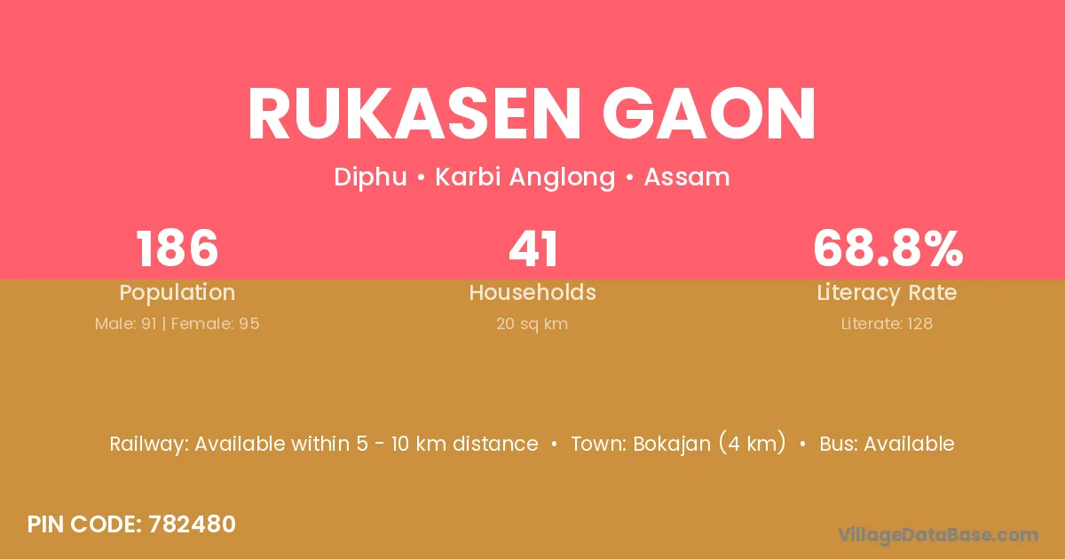 Rukasen Gaon village has a total population of 186 people, of which 91 are males and 95 are females.