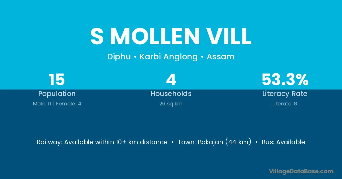 S Mollen Vill village has a total population of 15 people, of which 11 are males and 4 are females.