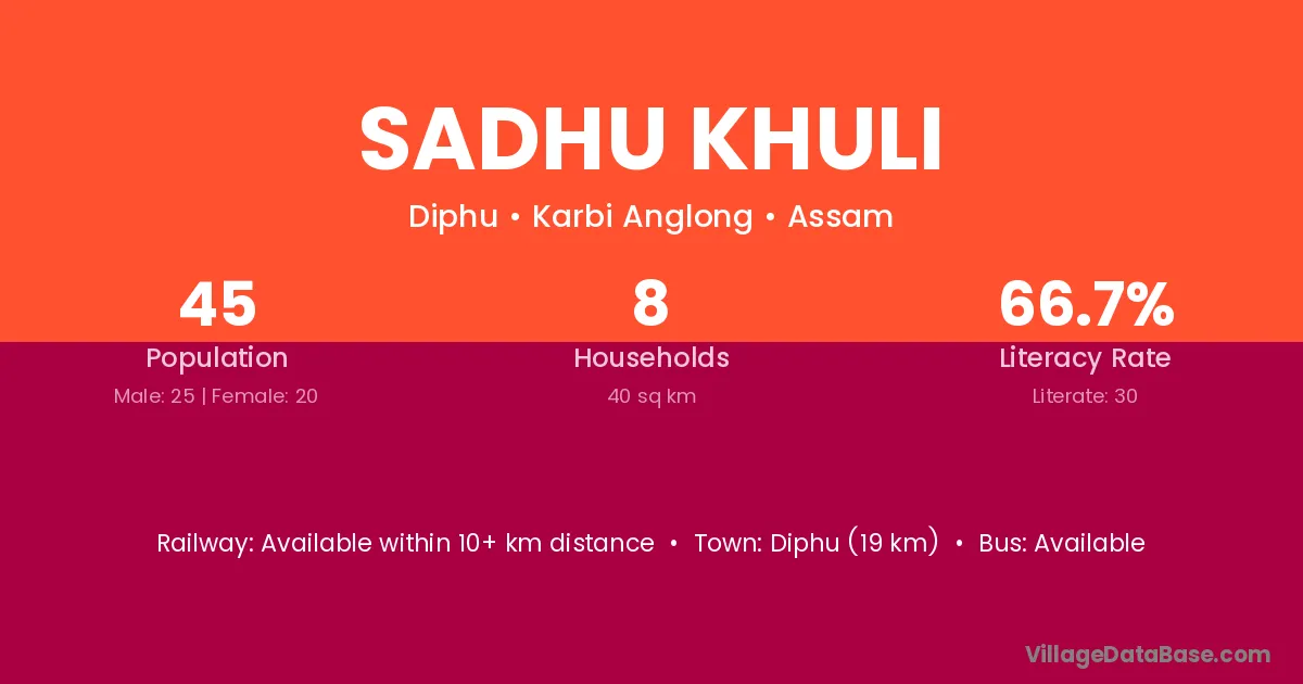 Diphu (19 km) is the nearest town to Sadhu Khuli village for major economic activities and is located approximately 19 km away.