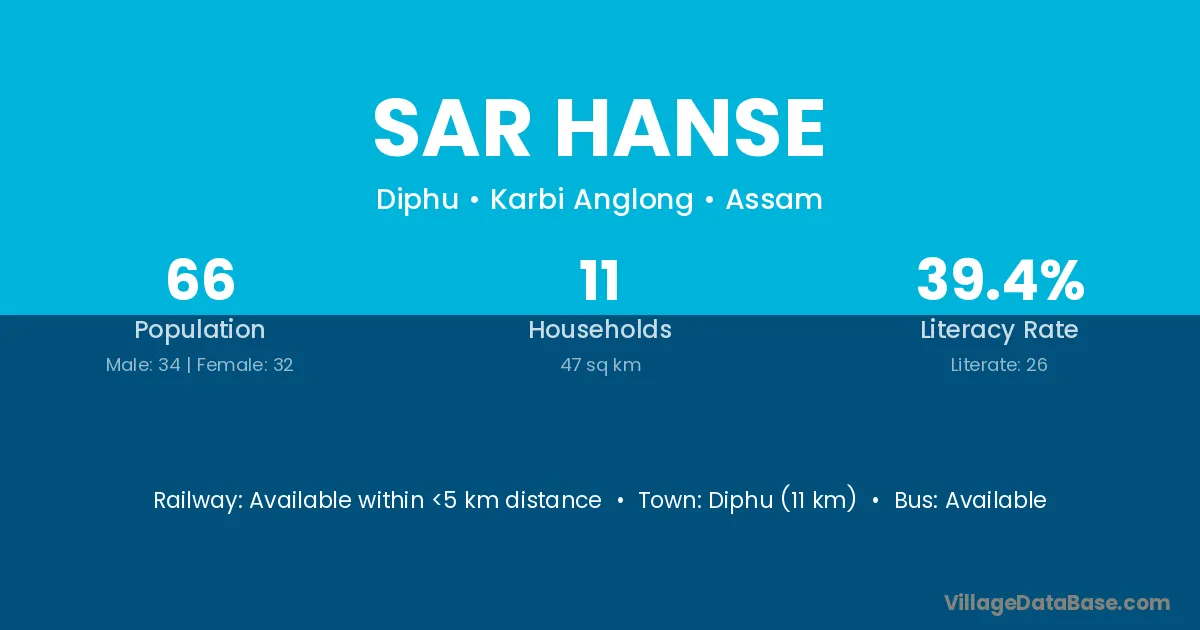Diphu (11 km) is the nearest town to Sar Hanse village for major economic activities and is located approximately 11 km away.