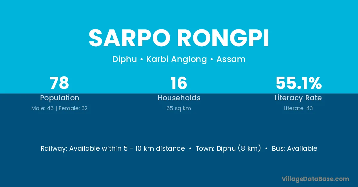 Diphu (8 km) is the nearest town to Sarpo Rongpi village for major economic activities and is located approximately 8 km away.
