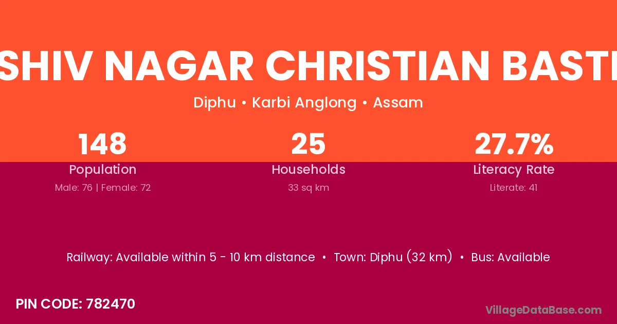 Diphu (32 km) is the nearest town to Shiv Nagar Christian Basti village for major economic activities and is located approximately 32 km away.