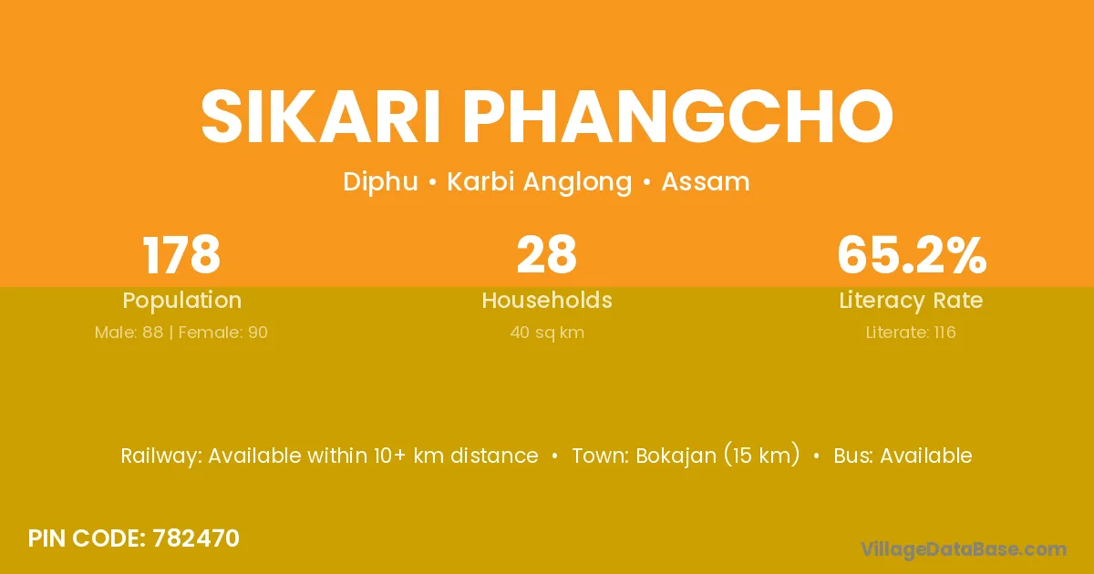 Bokajan (15 km) is the nearest town to Sikari Phangcho village for major economic activities and is located approximately 15 km away.