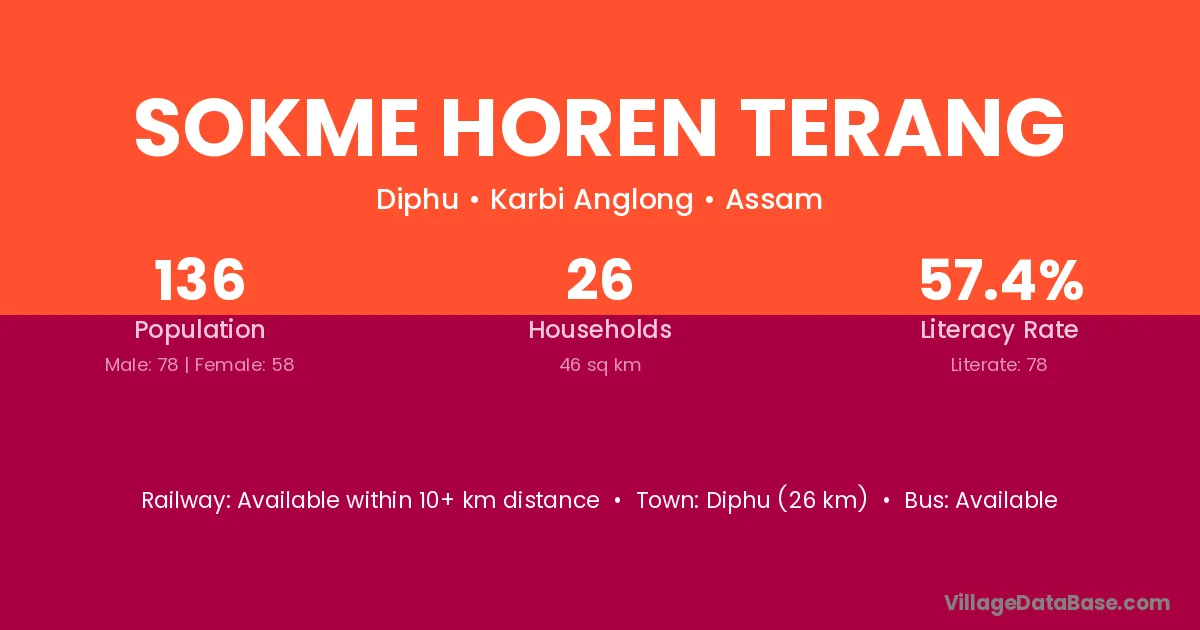 Diphu (26 km) is the nearest town to Sokme Horen Terang village for major economic activities and is located approximately 26 km away.