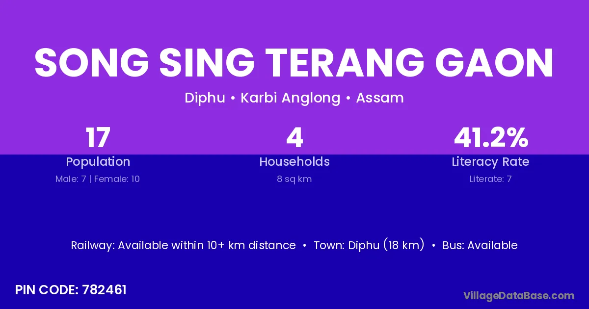 Diphu (18 km) is the nearest town to Song Sing Terang Gaon village for major economic activities and is located approximately 18 km away.
