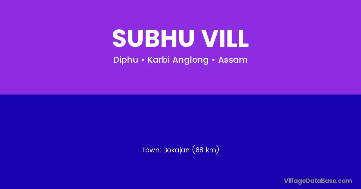 Bokajan (68 km) is the nearest town to Subhu Vill village for major economic activities and is located approximately 68 km away.