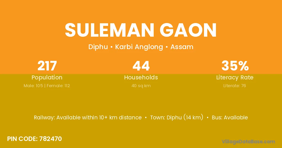 Diphu (14 km) is the nearest town to Suleman Gaon village for major economic activities and is located approximately 14 km away.