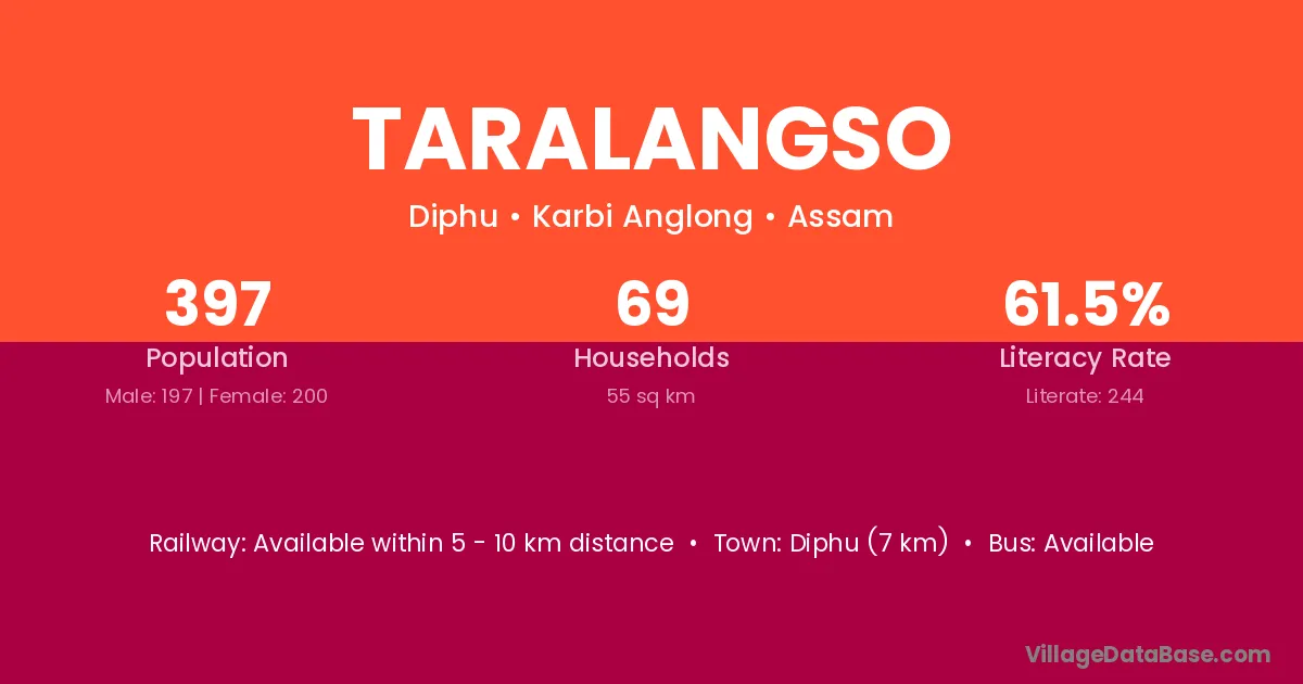 Diphu (7 km) is the nearest town to Taralangso village for major economic activities and is located approximately 7 km away.