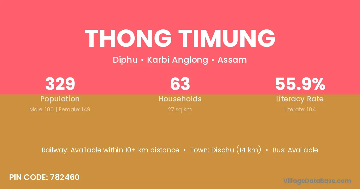 Disphu (14 km) is the nearest town to Thong Timung village for major economic activities and is located approximately 14 km away.