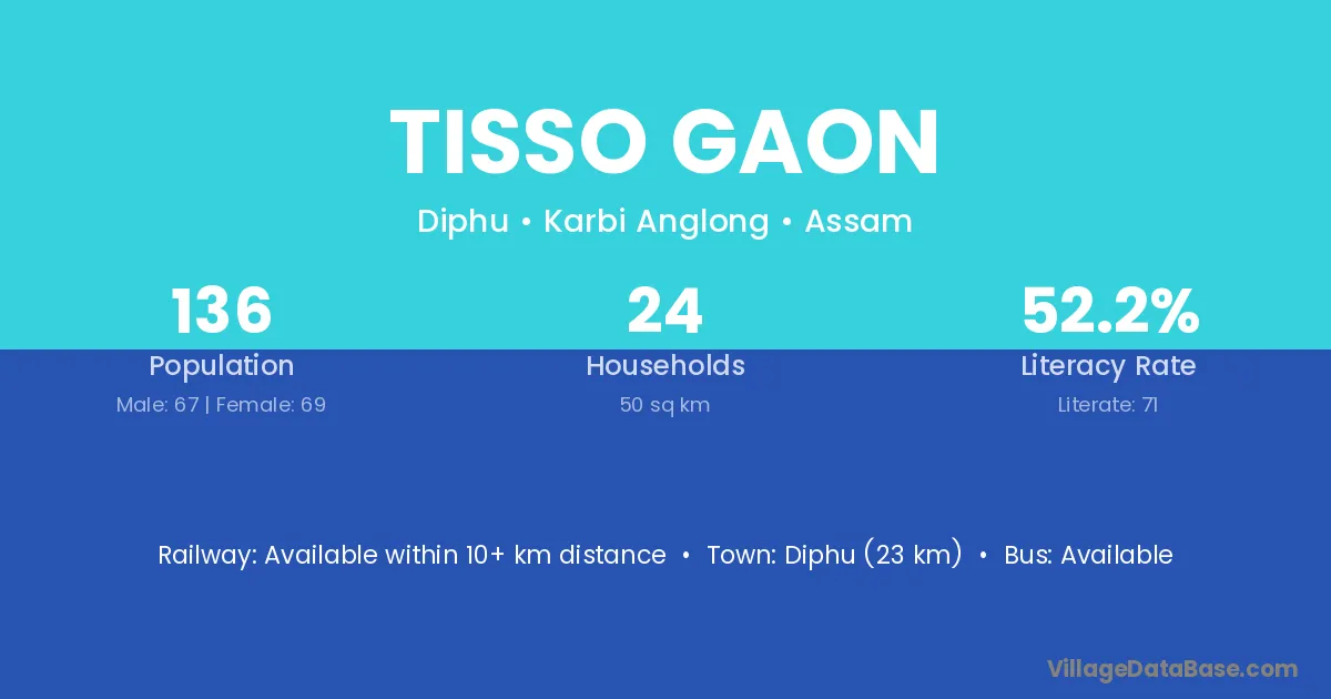 Tisso Gaon village has a total population of 136 people, of which 67 are males and 69 are females.