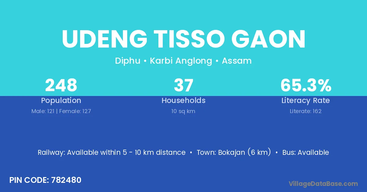 Bokajan (6 km) is the nearest town to Udeng Tisso Gaon village for major economic activities and is located approximately 6 km away.