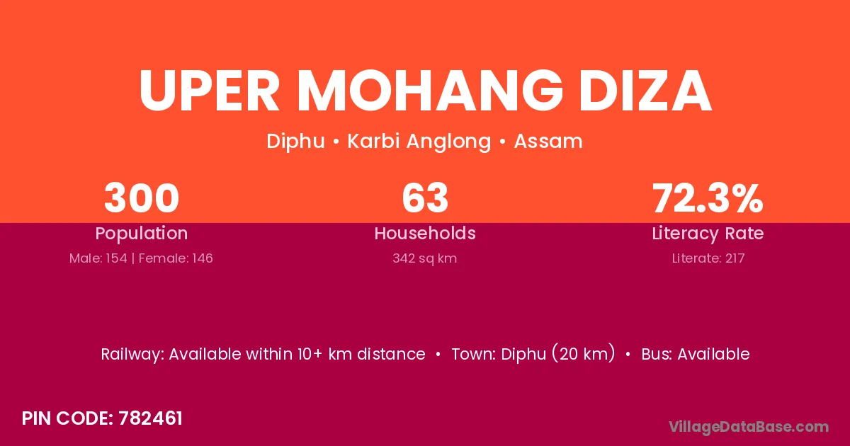 Diphu (20 km) is the nearest town to Uper Mohang Diza village for major economic activities and is located approximately 20 km away.