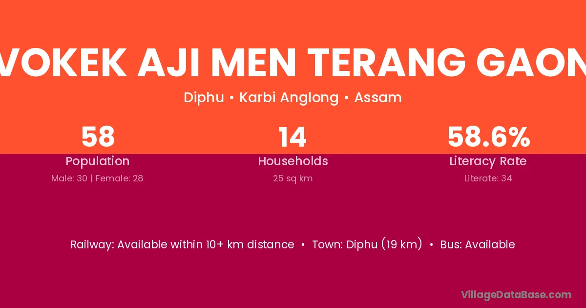 Diphu (19 km) is the nearest town to Vokek Aji Men Terang Gaon village for major economic activities and is located approximately 19 km away.