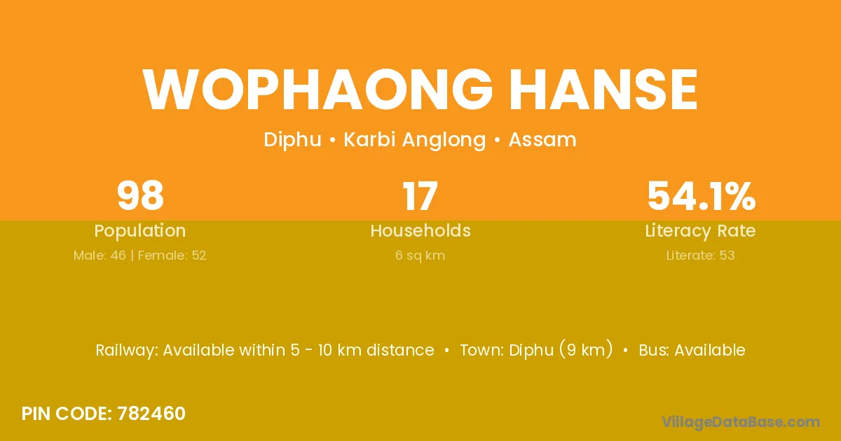 Diphu (9 km) is the nearest town to Wophaong Hanse village for major economic activities and is located approximately 9 km away.