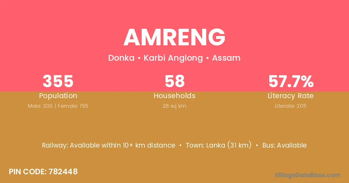 Lanka (31 km) is the nearest town to Amreng village for major economic activities and is located approximately 31 km away.