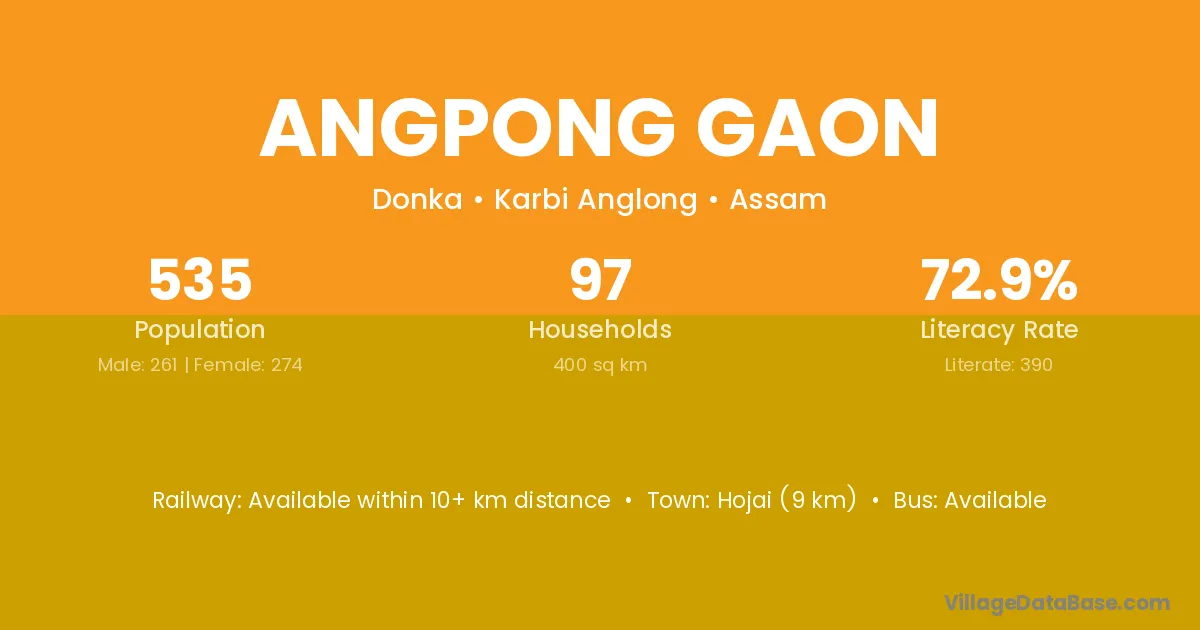 Hojai (9 km) is the nearest town to Angpong Gaon village for major economic activities and is located approximately 9 km away.