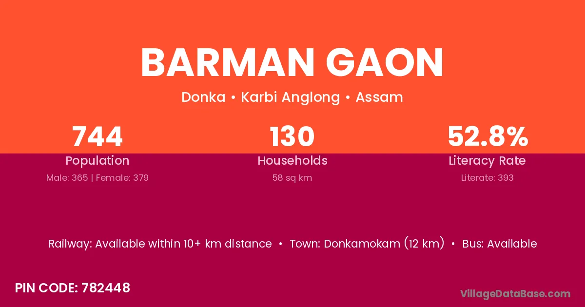 Donkamokam (12 km) is the nearest town to Barman Gaon village for major economic activities and is located approximately 12 km away.