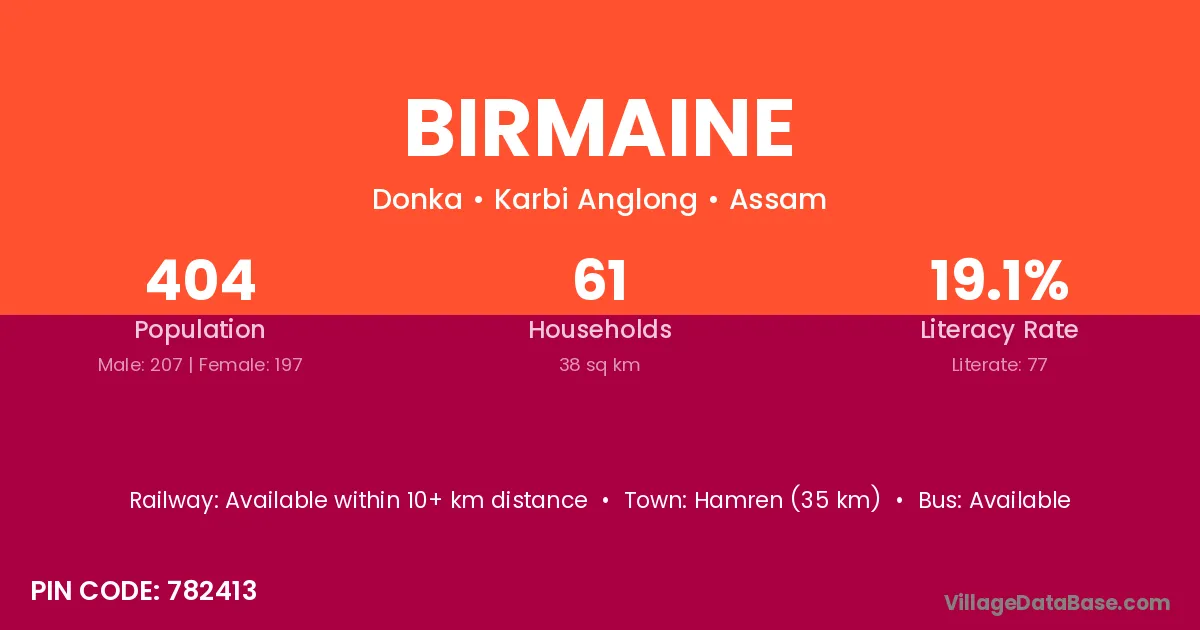 Hamren (35 km) is the nearest town to Birmaine village for major economic activities and is located approximately 35 km away.
