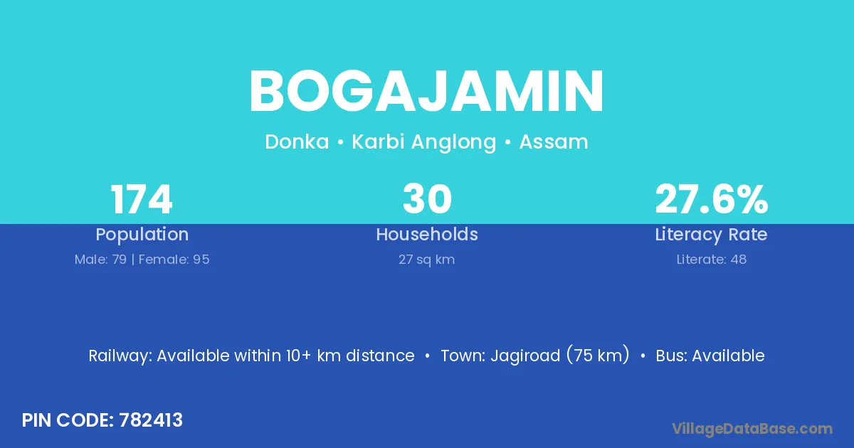 Jagiroad (75 km) is the nearest town to Bogajamin village for major economic activities and is located approximately 75 km away.