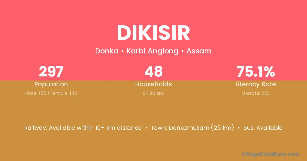 Dikisir village has a total population of 297 people, of which 155 are males and 142 are females.
